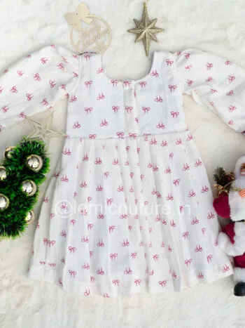 LM6297 – Adorable White Cotton Christmas Frock (Dreamy Bow Print)