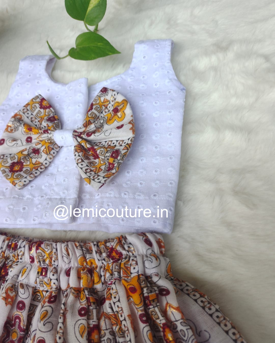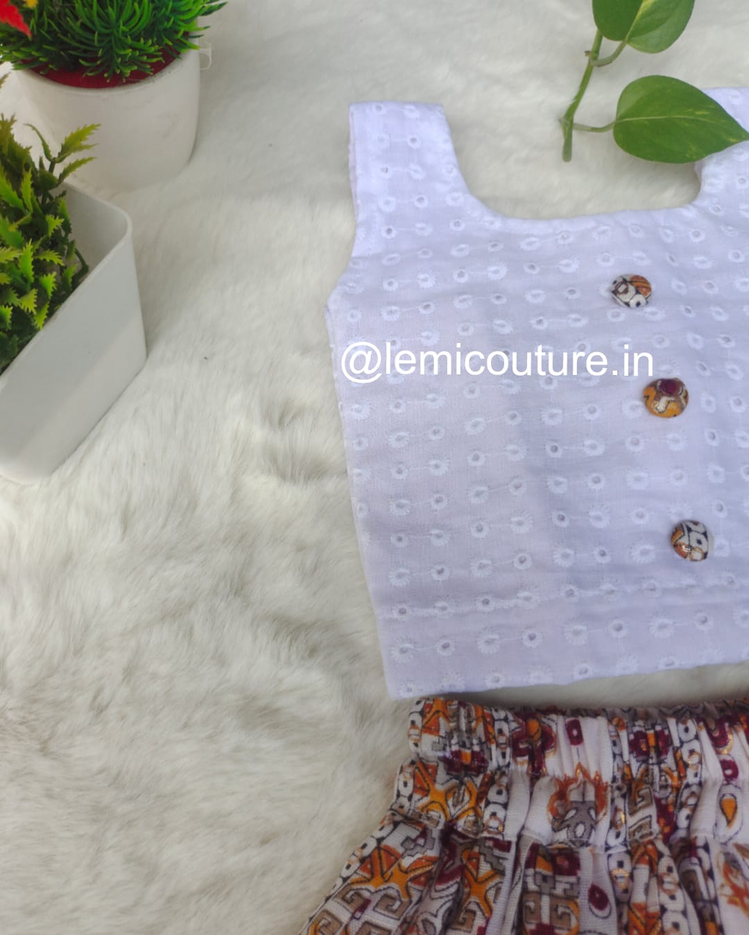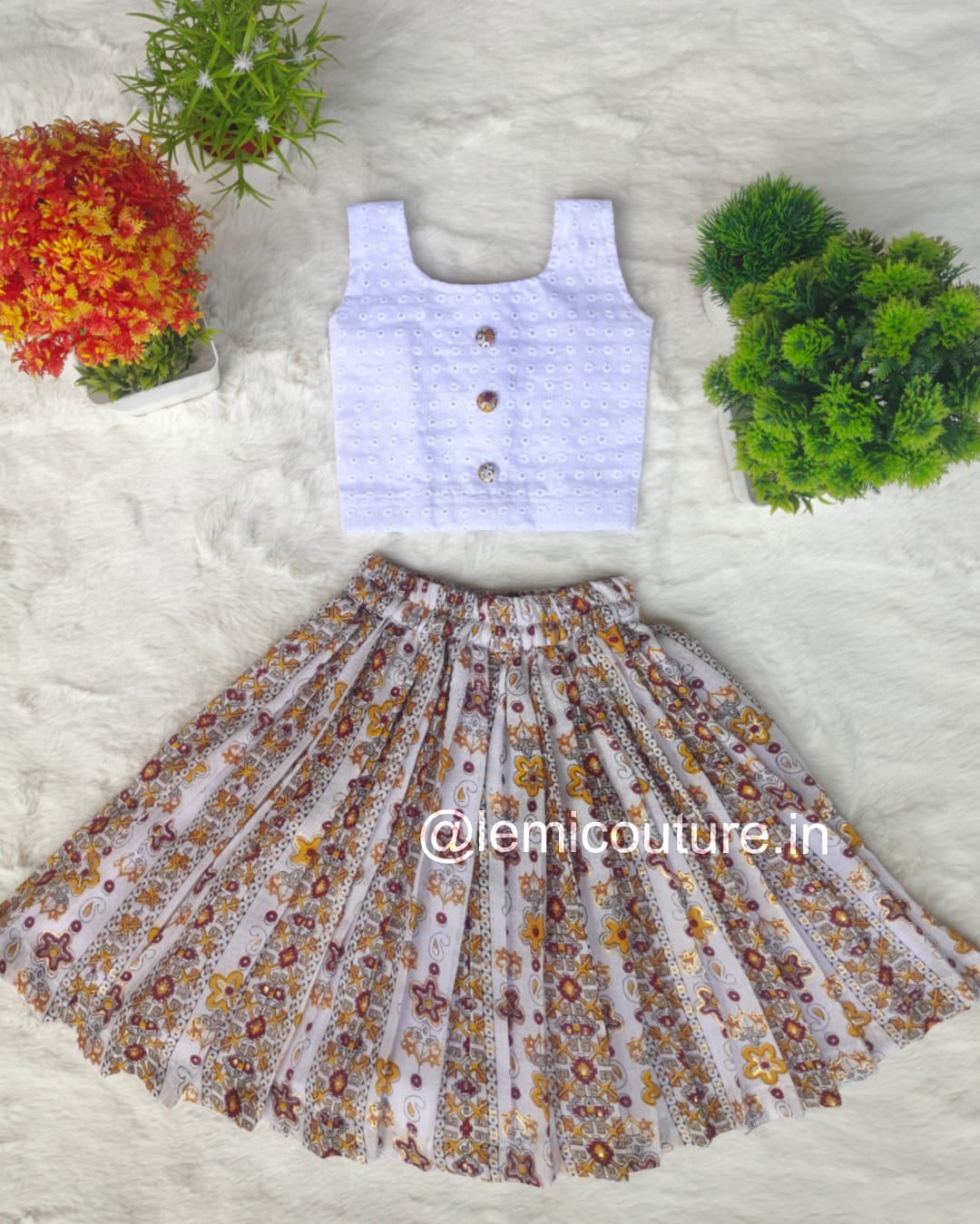The beauty of this traditional outfit lies in its contrasting textures. The top is crafted from high-quality Hakoba Top and Cotton Skirt material (also known as Broderie Anglaise). The intricate eyelet embroidery gives it a rich, textured look. The skirt contrasts this with a smooth, vibrant multicolored cotton fabric that feels soft against the skin, making it an ideal breathable kids fashion choice.
