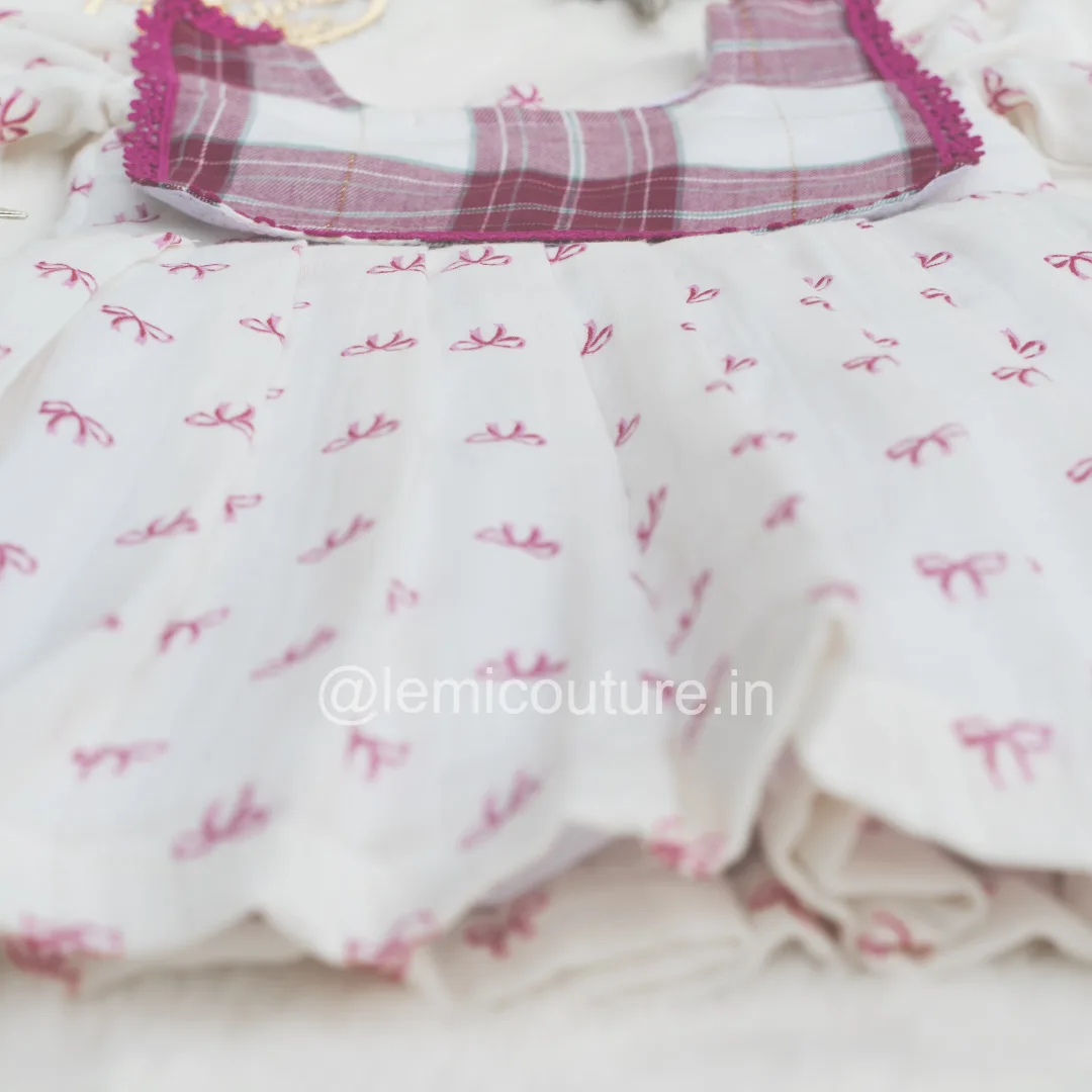 - The Print: The base of the frock is a pristine white, scattered with an adorable print of tiny pink bows. This minimalist print is sweet and sophisticated, moving away from loud cartoons to a more refined, boutique aesthetic.
