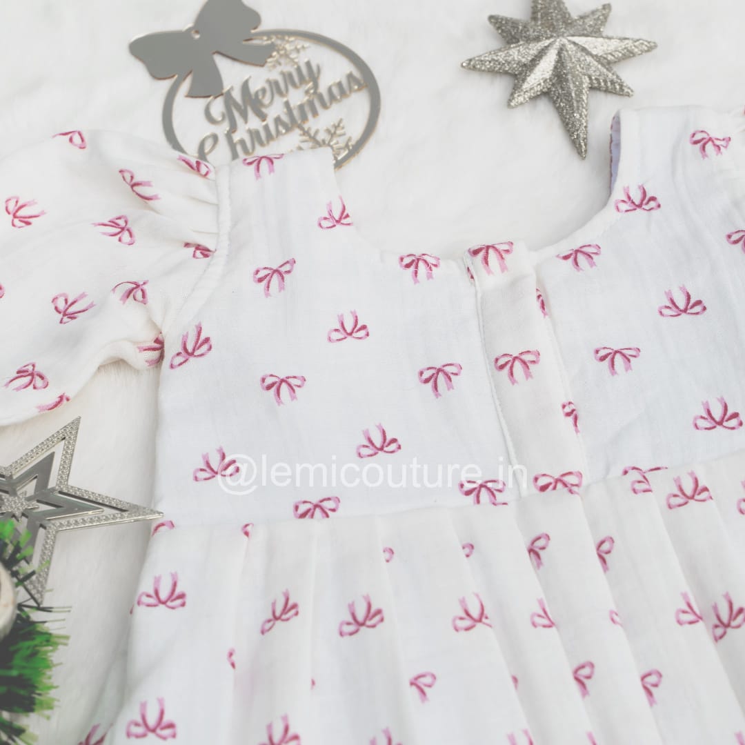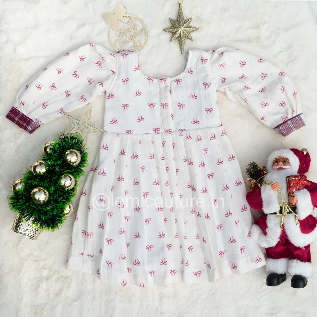 LM6297 – Adorable White Cotton Christmas Frock (Dreamy Bow Print)